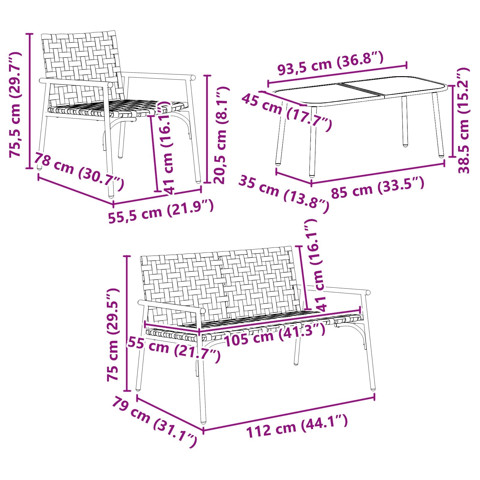 Dieses Garten-Dining-Set ist ideal für Outdoor-Treffen und besticht durch sein cooles Design mit einem schlanken, rechteckigen Tisch und gut proportionierten Sitzgelegenheiten. Es passt perfekt in jeden Garten oder auf jede Terrasse und wertet deinen Bereich mit einfacher Funktionalität und einem schlichten, stylischen Look auf. Das Set ist der perfekte Ort für Outdoor-Dining und entspannte Gespräche, sodass jeder mit Leichtigkeit Platz findet. Robuster Rahmen: Das Set besteht aus Poly-Rattan und Stahl, perfekt für Haltbarkeit. Diese Materialien bieten eine stabile Basis und sehen dazu noch gut aus. Sie wurden sorgfältig ausgewählt, um sicherzustellen, dass das Set lange schön und funktional bleibt. Funktionale Komponenten: Die Rückenlehnen aus Poly-Rattan und die stabilen Stahlbeine bringen spezifische Vorteile mit sich. So genießt du besten Sitzkomfort und kannst dich darauf verlassen, dass es auch auf verschiedenen Oberflächen stabil steht. Moderne Ästhetik: Mit schlankem, modernem Design zieht dieses Dining-Set alle Blicke auf sich. Klare Linien und minimalistischer Stil fügen sich harmonisch in Gärten und Terrassen ein und schaffen Atmosphäre für geselliges Beisammensein. Outdoor-Sitzgelegenheiten: Das Set hält verschiedenen Wetterbedingungen stand und sorgt im Garten oder auf der Terrasse für eine verlässliche Sitzgelegenheit. Robuste Materialien garantieren, dass es auch bei intensiver Sonneneinstrahlung lange seine Form behält. Pflegehinweise: Damit dein Set lange schön bleibt, empfehlen wir, es nicht ungeschützt draußen stehen zu lassen. Eine Abdeckung schütz es vor rauen Bedingungen, verlängert die Lebensdauer und sorgt dafür, dass es zu jedem Anlass ein Blickfang bleibt.