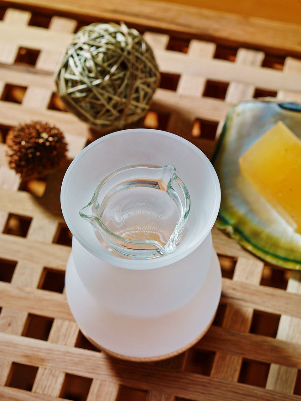 Das mundgeblasene und durchscheinende Glas steht auf einem handgefertigten hölzernen Untersatz aus natürlichem Arvenholz. Die elegante und harmonisch gestaltete Form sorgt für ein sanftes, gedämpftes Kerzenlicht. Die einzigartige und raffinierte Kombination von Räuchergefäß und Aroma-Diffusor lässt viele Anwendungen zu. Sie können die hitzebeständige Räucherschale (mit Blume des Lebens) mit Ihren Räuchermischungen oder Aroma-Ölen füllen, um angenehme natürliche Düfte für die Anwendung drinnen und draußen zu schaffen.