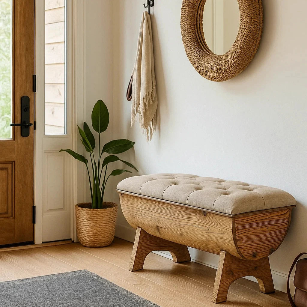 Diese markante, fassförmige Aufbewahrungsbank strahlt einen rustikalen Charme aus, der sie zu einer großartigen Ergänzung Ihrer Einrichtung macht. Sie kann auch als Fußablage oder Aufbewahrungsbox verwendet werden. Die komfortable Bank ist aus massivem Tannenholz gefertigt und die Sitzfläche ist mit Stoff gepolstert. Sie bietet im Inneren viel Platz, um eine Vielzahl von verschiedenen Gegenständen außer Sichtweite, aber dennoch in Reichweite, aufzubewahren. Der robuste Holzsockel trägt zu ihrem rustikalen Charme bei. Die Montage dieses Produkts geht leicht von Hand.