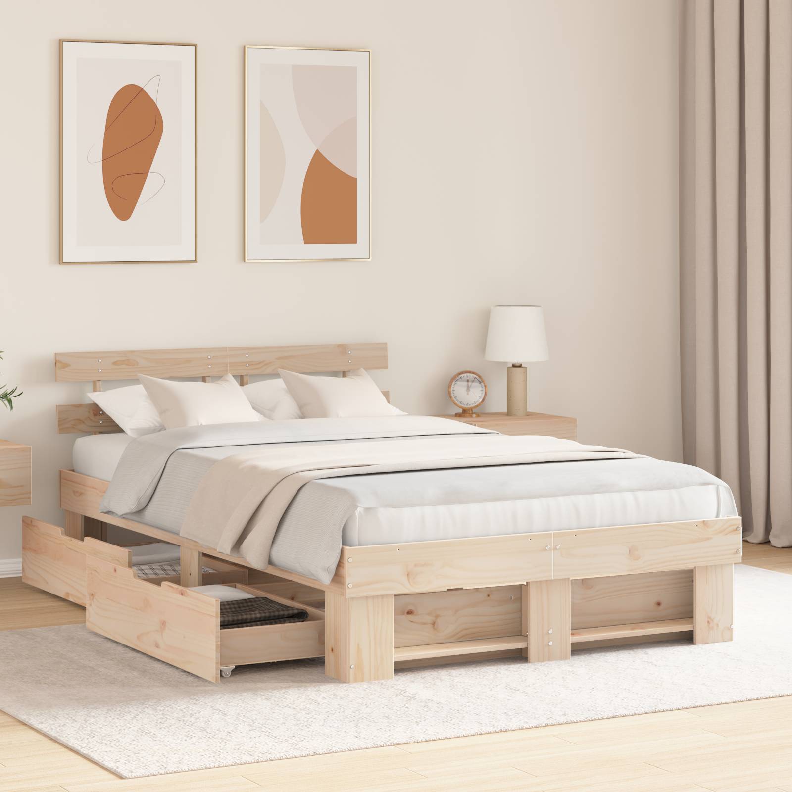 Dieses moderne Bettgestell steht für zeitgenössisches Design und Funktionalität. Mit seiner klaren rechteckigen Form und minimalistischen Ästhetik ist es ein toller Blickfang in jedem Schlafzimmer. Es vereint Stil und Zweck und eignet sich bestens für alle, die klare Linien und einfache Gestaltung mögen. Egal ob in schick urbanen Wohnungen oder ruhigen Vororten, das Bett fügt sich nahtlos in verschiedene Wohnstile ein und bietet praktische Nützlichkeit. Massivholz Kiefer material sorgt für extrem hohe Langlebigkeit und passt perfekt in moderne Innenräume. Es bringt eine natürliche, warme Ausstrahlung in dein Schlafzimmer. Kopf- und Rahmenkonstruktion bietet eine stabile Basis, die für den täglichen Gebrauch ausgelegt ist. Jedes Element vom Rahmen bis zu den Latten sorgt dafür, dass du Jahr für Jahr erholsamen Schlaf genießen kannst. Effiziente Designmerkmale , wie die Betthöhe von 31 cm, ermöglichen leichten Zugang und einfache Reinigung. Der stabile Lattenrost verbessert die Unterstützung für die Matratze. Reichlich Schubladenstauraum im Bettgestell sorgt für Ordnung im Schlafzimmer. Die clever platzierten Schubladen maximieren den Raum, aber der Stil und Komfort kommen nicht zu kurz. Einfache Pflegehinweise helfen dir, das makellose Aussehen des Bettes leicht zu bewahren – einfach mit einem feuchten Tuch abwischen. Diese einfache Pflege sorgt für Langlebigkeit und erhält den schicken Look.