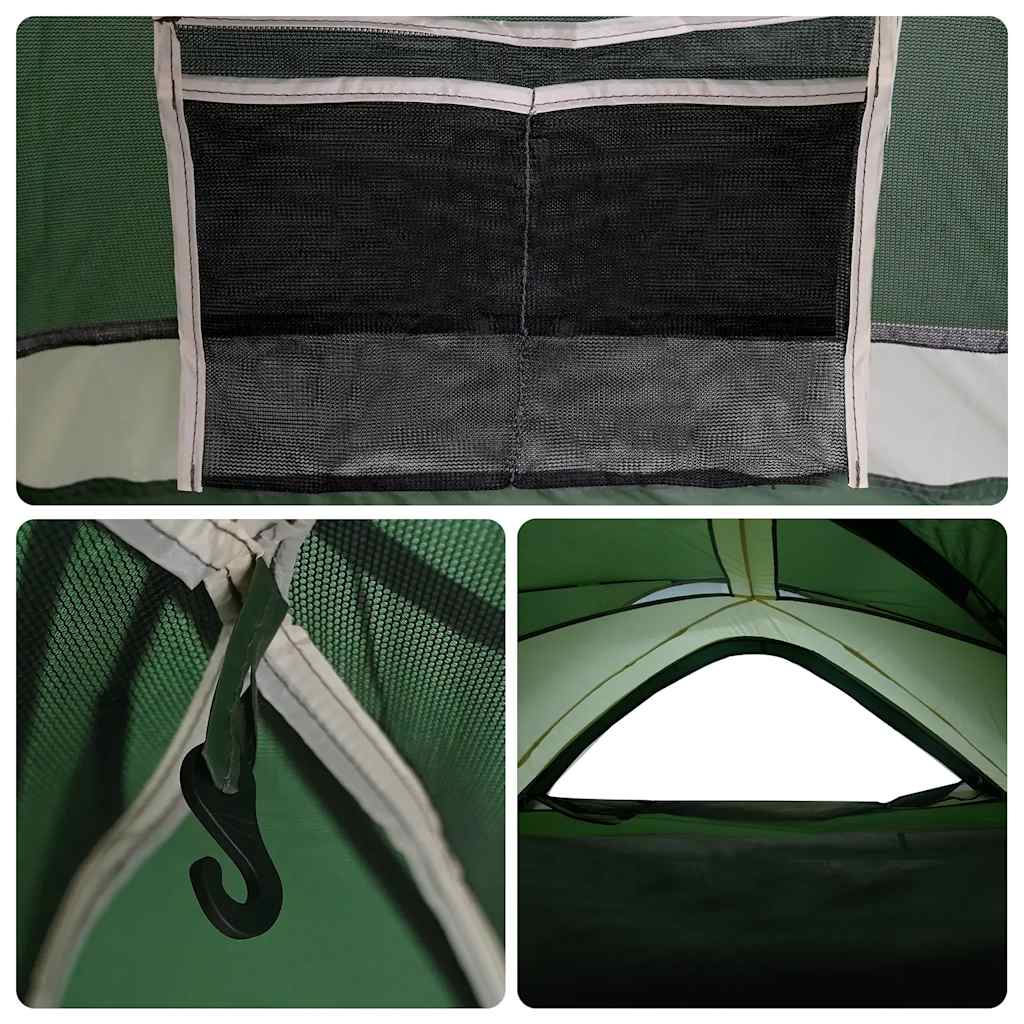 Dieses Campingzelt im modernen Look schützt vor unangenehmen Wetter und bietet einen komfortablen Ort bei Abenteuern. Rundum wasserdichtes Design: Aus Polyester mit PU-Beschichtung gefertigt, ist dieses Campingzelt wasser- und winddicht. Die versiegelten Nähte verhindern effektiv das Eindringen von Regenwasser, während die strapazierfähige Bodenplane für ein trockenes und komfortables Interieur sorgt.Abnehmbares Überzelt: Das abnehmbare Überzelt lässt sich an der Zeltoberseite befestigen, um Wetterschutz zu bieten und Privatsphäre zu schaffen.Einfacher Auf- und Abbau: Die hochflexiblen und leichten Glasfaserstangen und das praktische Steckverbindungssystem machen den Auf- und Abbau des Zeltes zum Kinderspiel.Zusätzlicher Stauraum: In der Aufbewahrungstasche kannst du Mobiltelefon, Schlüssel oder verschiedene Kleinigkeiten ordentlich und griffbereit aufbewahren.Leicht und tragbar: Dank des faltbaren und leichten Designs lässt sich das Zelt einfach verpacken und in der mitgelieferten Tragetasche mühelos verstauen und transportieren. Achtung:Halte alle Flammen und Wärmequellen von diesem Zeltstoff fern.
