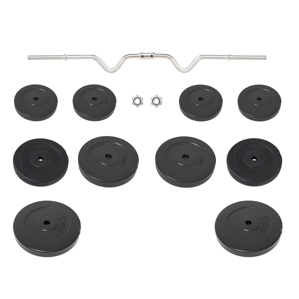 - Gewicht der Hantelscheiben: 4 x 5 kg, 2 x 7,5 kg, 2 x 10 kg, 2 x 15 kg