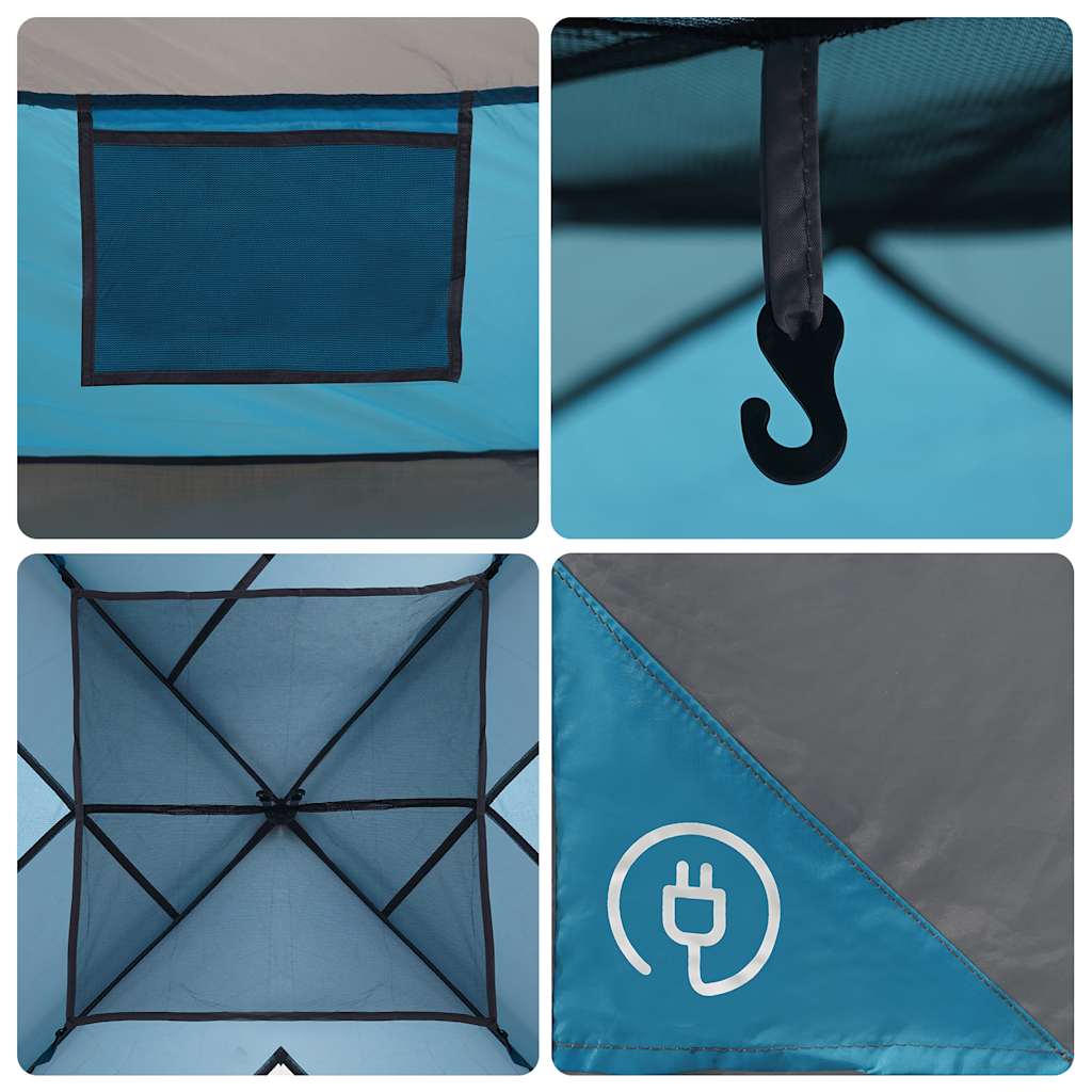 Dieses moderne Familienzelt schützt vor unangenehmen Wetter und bietet einen komfortablen Platz bei Abenteuern. Rundum wasserdichtes Design: Aus Polyester mit PU-Beschichtung gefertigt, ist dieses Campingzelt wasser- und winddicht. Die versiegelten Nähte verhindern effektiv das Eindringen von Regenwasser, während die strapazierfähige Bodenplane für ein trockenes und komfortables Interieur sorgt.Einfacher Auf- und Abbau: Die hochflexiblen und leichten Glasfaserstangen und das praktische Steckverbindungssystem machen den Auf- und Abbau des Zeltes zum Kinderspiel.Abnehmbares Überzelt: Das abnehmbare Überzelt lässt sich an der Zeltoberseite befestigen, um Wetterschutz zu bieten und Privatsphäre zu schaffen.Praktischer Zugang zum Stromkabel: Dank des E-Anschlusses kannst du ganz einfach ein Verlängerungskabel von einer externen Stromquelle an dein Zelt anschließen.Leicht und tragbar: Dank des faltbaren und leichten Designs lässt sich das Zelt einfach verpacken und in der mitgelieferten Tragetasche mühelos verstauen und transportieren. Achtung:Halte alle Flammen und Wärmequellen von diesem Zeltstoff fern.