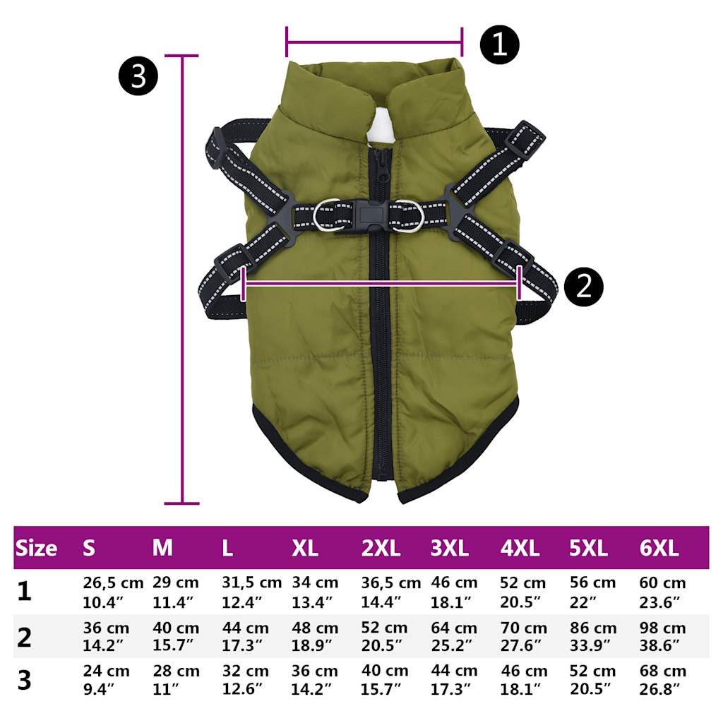 Mit diesem gemütlichen Hundemantel mit integriertem Geschirr hältst du deinen Hund an kalten Tagen angenehm warm! Wasserdicht und bequem: Dieser Hundemantel verfügt über eine wasserdichte Außenschicht, um dein Haustier trocken zu halten, ein weiches Fleece-Futter für Wärme und eine zusätzliche Polsterung für Komfort. Er eignet sich perfekt für Outdoor-Abenteuer bei jedem Wetter.Verstellbares Geschirr: Dieser Hundemantel verfügt über verstellbare Gurte, um eine perfekte Passform und höchsten Komfort zu bieten.Reflexstreifen: Dank der Reflexstreifen sorgt die Hundeweste für eine bessere Sichtbarkeit bei schlechten Lichtverhältnissen, um deine Sicherheit und die Sicherheit deines Hundes bei Nachtspaziergängen zu gewährleisten.Praktischer Reißverschluss: Der Reißverschluss vereinfacht das An- und Ausziehen deines Haustieres, um dir Zeit zu sparen, wenn du losziehst.D-Ring-Befestigung: Die stabilen D-Ringe ermöglichen eine sichere Befestigung der Leine, was zusätzliche Sicherheit bietet und dieses Produkt zu einer idealen Wahl für Spaziergänge macht. Gut zu wissen:Wenn die Messung zwischen zwei Größen liegt oder wenn Ihr Hund stark oder buschig ist. Wir empfehlen Ihnen, eine etwas größere Größe zu kaufen, um sicherzustellen, dass sie Ihrem Hund bequem passt.