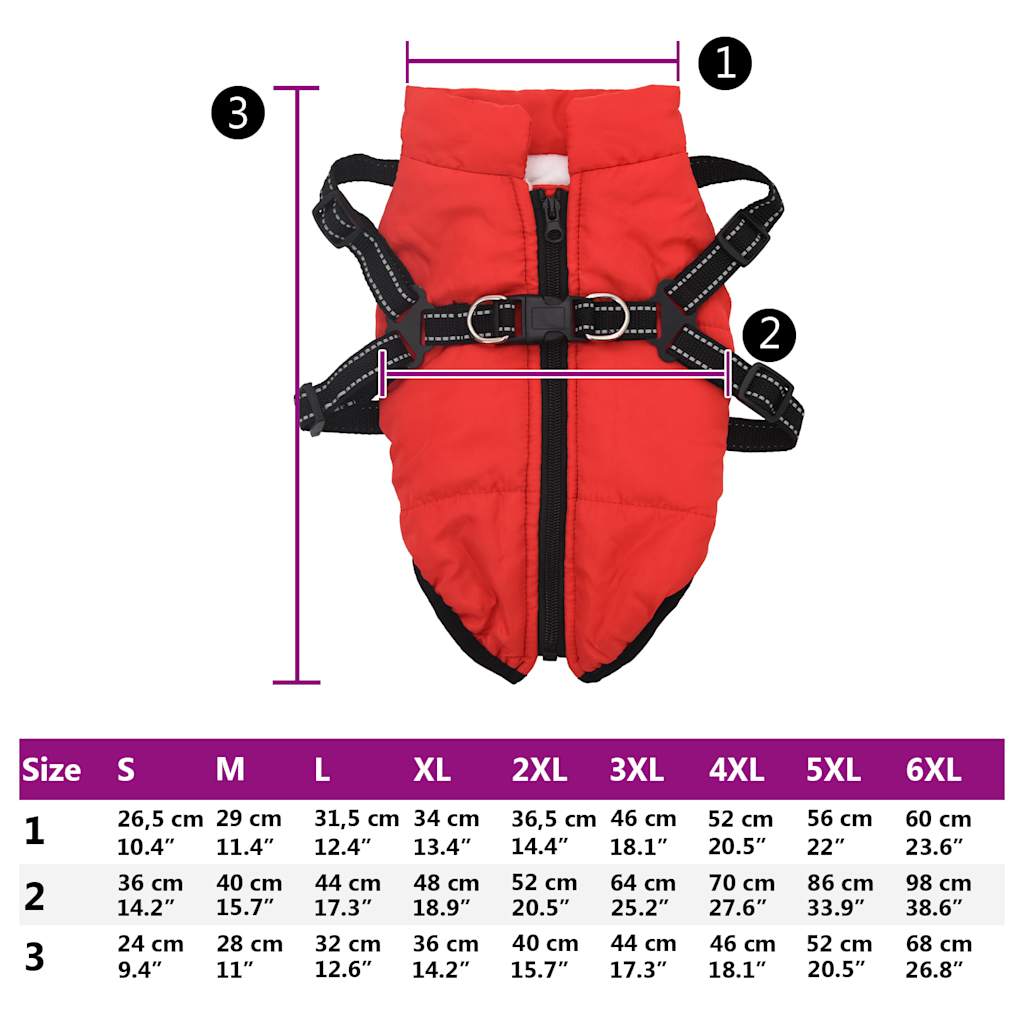 Mit diesem gemütlichen Hundemantel mit integriertem Geschirr hältst du deinen Hund an kalten Tagen angenehm warm! Wasserdicht und bequem: Dieser Hundemantel verfügt über eine wasserdichte Außenschicht, um dein Haustier trocken zu halten, ein weiches Fleece-Futter für Wärme und eine zusätzliche Polsterung für Komfort. Er eignet sich perfekt für Outdoor-Abenteuer bei jedem Wetter.Verstellbares Geschirr: Dieser Hundemantel verfügt über verstellbare Gurte, um eine perfekte Passform und höchsten Komfort zu bieten.Reflexstreifen: Dank der Reflexstreifen sorgt die Hundeweste für eine bessere Sichtbarkeit bei schlechten Lichtverhältnissen, um deine Sicherheit und die Sicherheit deines Hundes bei Nachtspaziergängen zu gewährleisten.Praktischer Reißverschluss: Der Reißverschluss vereinfacht das An- und Ausziehen deines Haustieres, um dir Zeit zu sparen, wenn du losziehst.D-Ring-Befestigung: Die stabilen D-Ringe ermöglichen eine sichere Befestigung der Leine, was zusätzliche Sicherheit bietet und dieses Produkt zu einer idealen Wahl für Spaziergänge macht. Gut zu wissen:Wenn die Messung zwischen zwei Größen liegt oder wenn Ihr Hund stark oder buschig ist. Wir empfehlen Ihnen, eine etwas größere Größe zu kaufen, um sicherzustellen, dass sie Ihrem Hund bequem passt.