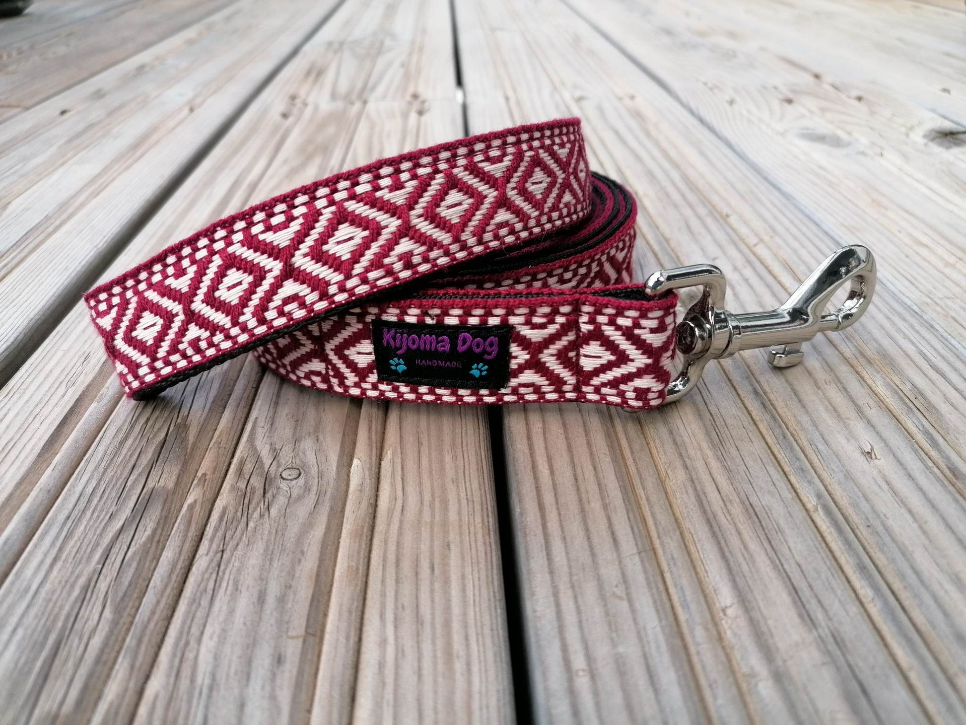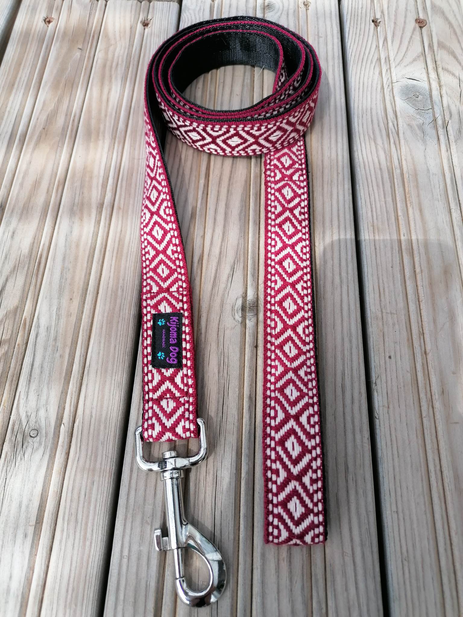 Die Leine besteht aus starkem Gurtband (Nylon) und hat einen Karabiner.