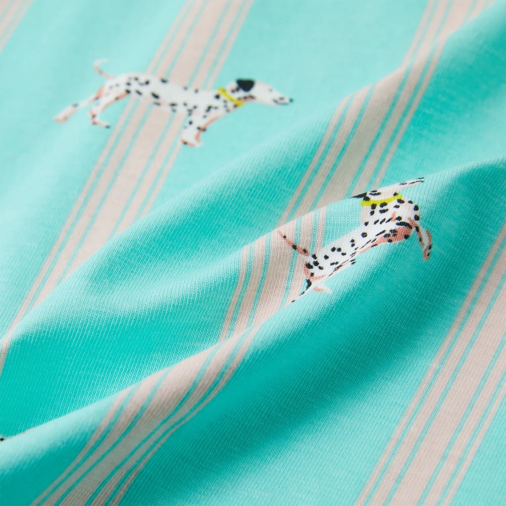 Dieser Kinderpyjama mit kurzen Ärmeln hat einen Rundhalsausschnitt, einen elastischen Bund und eine normale Passform. Der Pyjama ist mit vertikalen Streifen und gefleckten Hunden bedruckt. Der Kinder-Schlafanzug ist aus weichem Material gefertigt, das zu 95 % aus Baumwolle und zu 5 % aus Elastan besteht und daher nicht nur komfortabel, sondern auch atmungsaktiv ist.