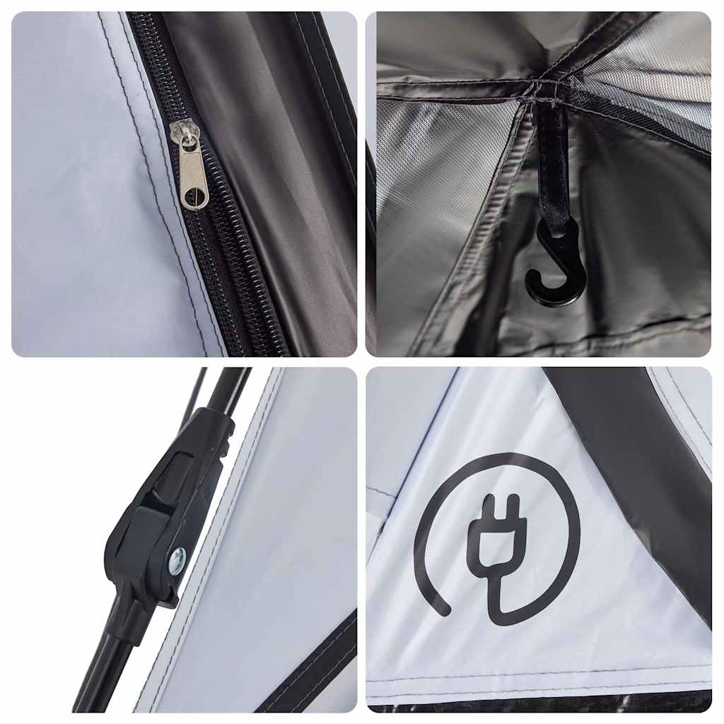 Dieses moderne Familienzelt schützt vor unangenehmen Wetter und bietet einen komfortablen Platz bei Abenteuern. Rundum wasserdichtes Design: Aus Polyester mit PU-Beschichtung gefertigt, ist dieses Campingzelt wasser- und winddicht. Die versiegelten Nähte verhindern effektiv das Eindringen von Regenwasser, während die strapazierfähige Bodenplane für ein trockenes und komfortables Interieur sorgt.Weißer Verdunkelungsstoff: Die speziell entworfene Zeltplane hält 99 % des Tageslichtes ab und sorgt so für eine kühlere und bequemere Schlafumgebung. Verabschiede dich also von der Morgensonne und genieße einen erholsamen Schlaf.Quick-Release-System: Dank des Quick-Release-Systems lässt sich das Zelt mühelos aufbauen! Lege das Zelt auf den Boden, ziehe das vormontierte Gestänge heraus, bis es einrastet, und schon ist das Zelt einsatzbereit!Gute Belüftung und Insektenschutz: Die Netzwände bieten nicht nur eine hervorragende Belüftung, sondern halten auch Insekten effektiv fern, um den Benutzern ein komfortables und insektenfreies Erlebnis zu bieten.Praktischer Zugang zum Stromkabel: Dank des E-Anschlusses kannst du ganz einfach ein Verlängerungskabel von einer externen Stromquelle an dein Zelt anschließen.Leicht und tragbar: Dank des faltbaren und leichten Designs lässt sich das Zelt einfach verpacken und in der mitgelieferten Tragetasche mühelos verstauen und transportieren. Achtung:Halte alle Flammen und Wärmequellen von diesem Zeltstoff fern.
