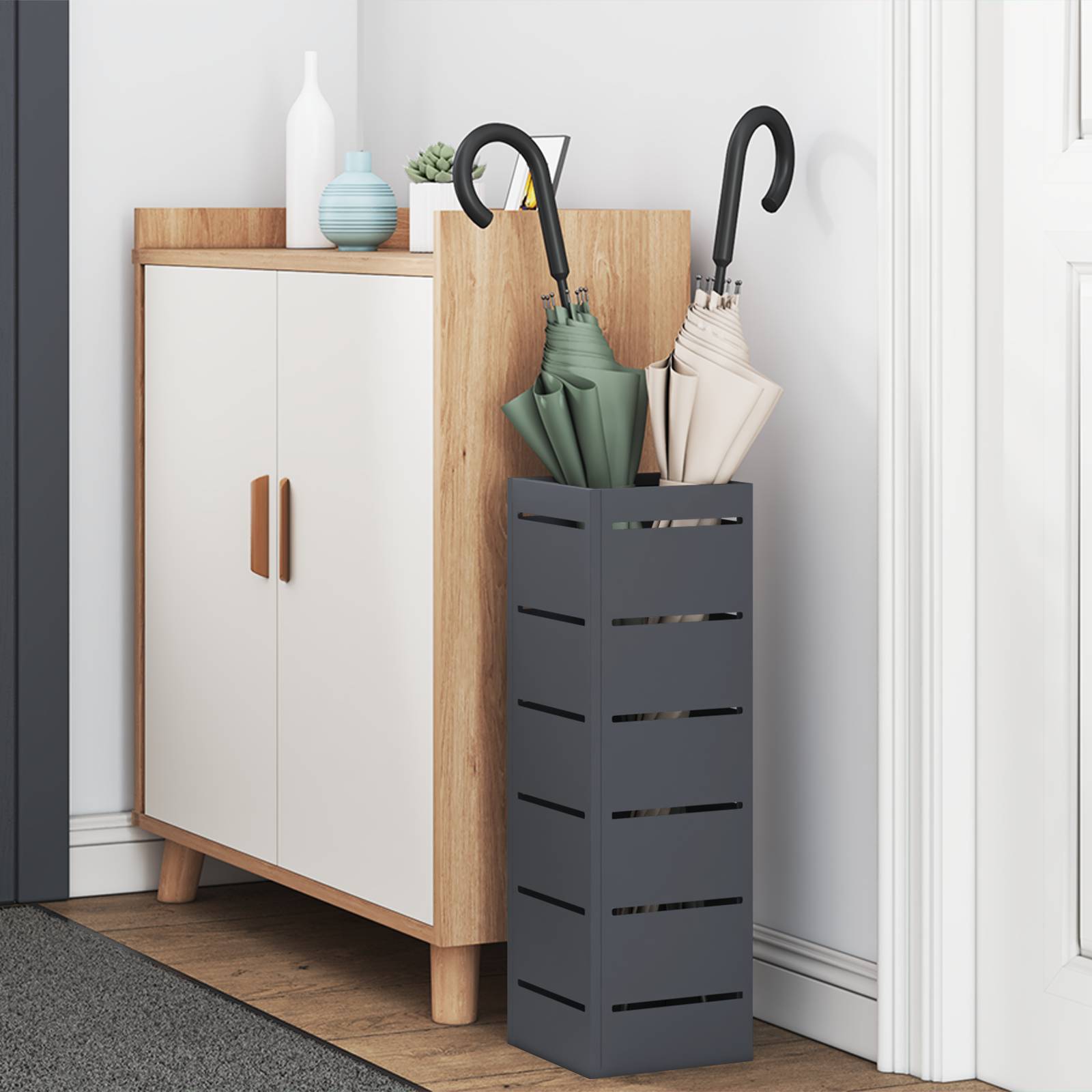 Dieser moderne Regenschirmständer bringt sowohl Stil als auch Funktionalität in deinen Wohnraum und bietet dir eine clevere Möglichkeit, deine Regenschirme und andere Dinge zu organisieren. Mit seinem schlanken, quadratischen Design passt er perfekt in moderne Interieurs und bietet viel Stauraum. Er fügt sich nahtlos in jedes Wohnzimmer, jeden Flur oder Eingangsbereich ein und ist nicht nur nützlich, sondern auch ein echtes Statement für modernen Minimalismus. Hergestellt aus robusten Materialien, ist dieser Regenschirmständer dafür gemacht, deinem Raum mit seinem coolen Look und praktischen Funktionen zu entsprechen. Robuster Stahlrahmen – Der Regenschirmständer ist aus Stahl und damit super stabil. Er hält dem täglichen Gebrauch stand und sieht dabei gut aus, ohne durch Feuchtigkeit oder Abnutzung Schaden zu nehmen. Der sorgfältige Zusammenbau sorgt dafür, dass er in jedes Zuhause passt und lange Unterstützung bietet. Kompakte Struktur – Das minimalistische, quadratische Design nimmt kaum Platz ein, was ihn ideal für enge Eingänge oder belebte Räume macht. Egal, ob du ihn neben einem Garderobenständer oder versteckt aufstellst, er hilft deinem Raum, besser zu funktionieren, ohne überladen zu wirken. Funktionales Design – Die moderne Form und die klaren Linien sorgen dafür, dass er super aussieht und gut in moderne Dekors passt. Es geht nicht nur um das Aussehen; auch die praktischen Aspekte machen ihn einfach überall in deinem Zuhause einsetzbar. Vielseitiger Stauraum: Mit zusätzlichen Fächern ist dieser Regenschirmständer perfekt, um verschiedene Dinge aufzubewahren. Er ist nicht nur für Regenschirme gedacht – du kannst auch Handschuhe, Schals oder Taschen darin verstauen. Alles bleibt ordentlich und griffbereit, wenn du es brauchst. Einfache Montage – Der Zusammenbau ist ganz einfach und du brauchst nur zwei Personen dafür. Die klare Anleitung macht den Aufbau leicht, sodass du schnell alles an Ort und Stelle hast.