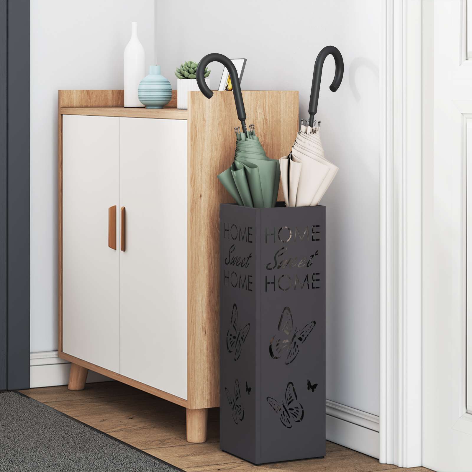 Dieser moderne Regenschirmständer bringt sowohl Stil als auch Funktionalität in deinen Wohnraum und bietet dir eine clevere Möglichkeit, deine Regenschirme und andere Dinge zu organisieren. Mit seinem schlanken, quadratischen Design passt er perfekt in moderne Interieurs und bietet viel Stauraum. Er fügt sich nahtlos in jedes Wohnzimmer, jeden Flur oder Eingangsbereich ein und ist nicht nur nützlich, sondern auch ein echtes Statement für modernen Minimalismus. Hergestellt aus robusten Materialien, ist dieser Regenschirmständer dafür gemacht, deinem Raum mit seinem coolen Look und praktischen Funktionen zu entsprechen. Robuster Stahlrahmen – Der Regenschirmständer ist aus Stahl und damit super stabil. Er hält dem täglichen Gebrauch stand und sieht dabei gut aus, ohne durch Feuchtigkeit oder Abnutzung Schaden zu nehmen. Der sorgfältige Zusammenbau sorgt dafür, dass er in jedes Zuhause passt und lange Unterstützung bietet. Kompakte Struktur – Das minimalistische, quadratische Design nimmt kaum Platz ein, was ihn ideal für enge Eingänge oder belebte Räume macht. Egal, ob du ihn neben einem Garderobenständer oder versteckt aufstellst, er hilft deinem Raum, besser zu funktionieren, ohne überladen zu wirken. Funktionales Design – Die moderne Form und die klaren Linien sorgen dafür, dass er super aussieht und gut in moderne Dekors passt. Es geht nicht nur um das Aussehen; auch die praktischen Aspekte machen ihn einfach überall in deinem Zuhause einsetzbar. Vielseitiger Stauraum: Mit zusätzlichen Fächern ist dieser Regenschirmständer perfekt, um verschiedene Dinge aufzubewahren. Er ist nicht nur für Regenschirme gedacht – du kannst auch Handschuhe, Schals oder Taschen darin verstauen. Alles bleibt ordentlich und griffbereit, wenn du es brauchst. Einfache Montage – Der Zusammenbau ist ganz einfach und du brauchst nur zwei Personen dafür. Die klare Anleitung macht den Aufbau leicht, sodass du schnell alles an Ort und Stelle hast.