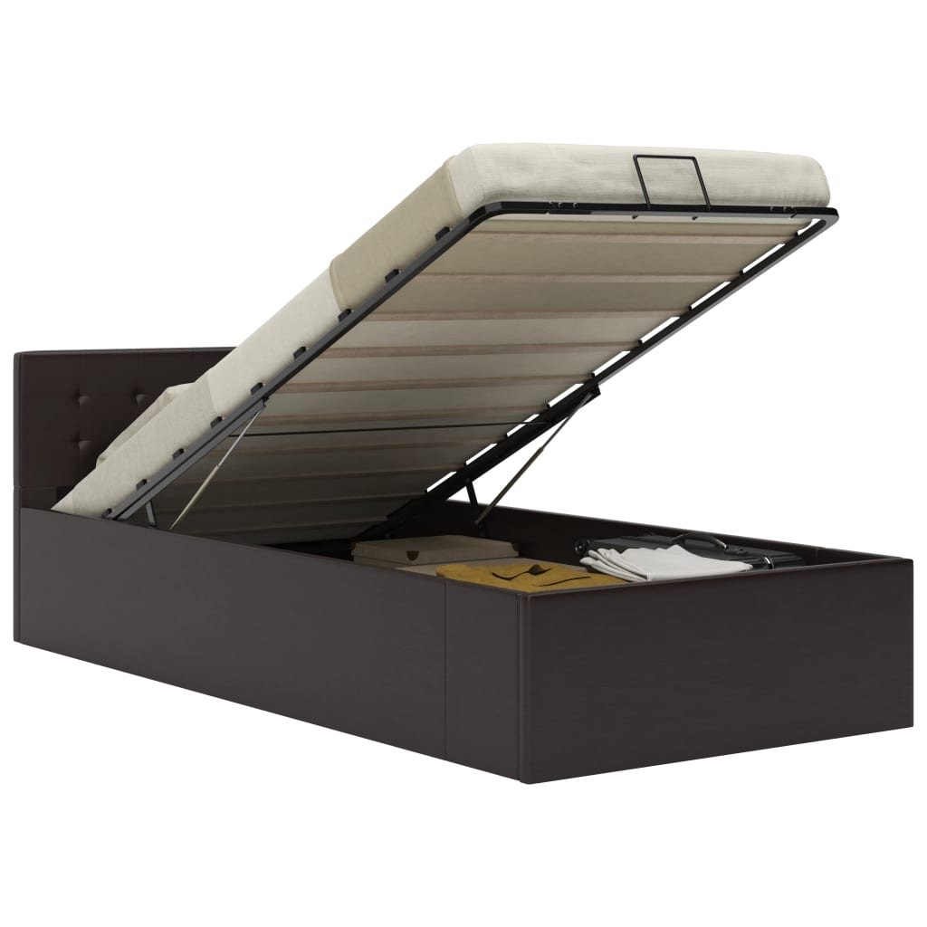 Verleihen Sie Ihrem Schlafzimmer mit diesem hydraulischen Bettgestell aus Kunstleder sofort ein beeindruckendes und modernes Aussehen! Dieses Einzelbett zeichnet sich durch ein schlichtes und zugleich stilvolles Design sowie einer soliden Konstruktion aus, da es aus starkem und robustem MDF gefertigt ist. Dieses Polsterbett verwandelt den ungenutzten Raum unter der Matratze in einen Stauraum mit viel Platz zur Aufbewahrung von Kleidung, Laken, Decken usw. Der hydraulische Gashebemechanismus macht das Anheben der Matratze zum Kinderspiel. Der Lattenrost steht nach dem Anheben aufrecht, sodass Sie beide Hände frei haben, um darunter liegende Gegenstände zu entfernen oder zu verstauen. Der pulverbeschichtete Stahlrahmen und die Sperrholzlatten tragen zur Robustheit und Langlebigkeit des Bettes bei. Das mit glänzendem Kunstleder gepolsterte Bett wirkt einladend und ist pflegeleicht. Dieser Artikel ist leicht zu montieren. Dieses Schlafzimmermöbel ist für eine Matratze von 100×200 cm geeignet. Bitte beachten Sie, dass im Lieferumfang nur das Bettgestell enthalten ist. Eine Matratze ist nicht im Lieferumfang enthalten. In unserem Shop finden Sie die passenden Matratzen.