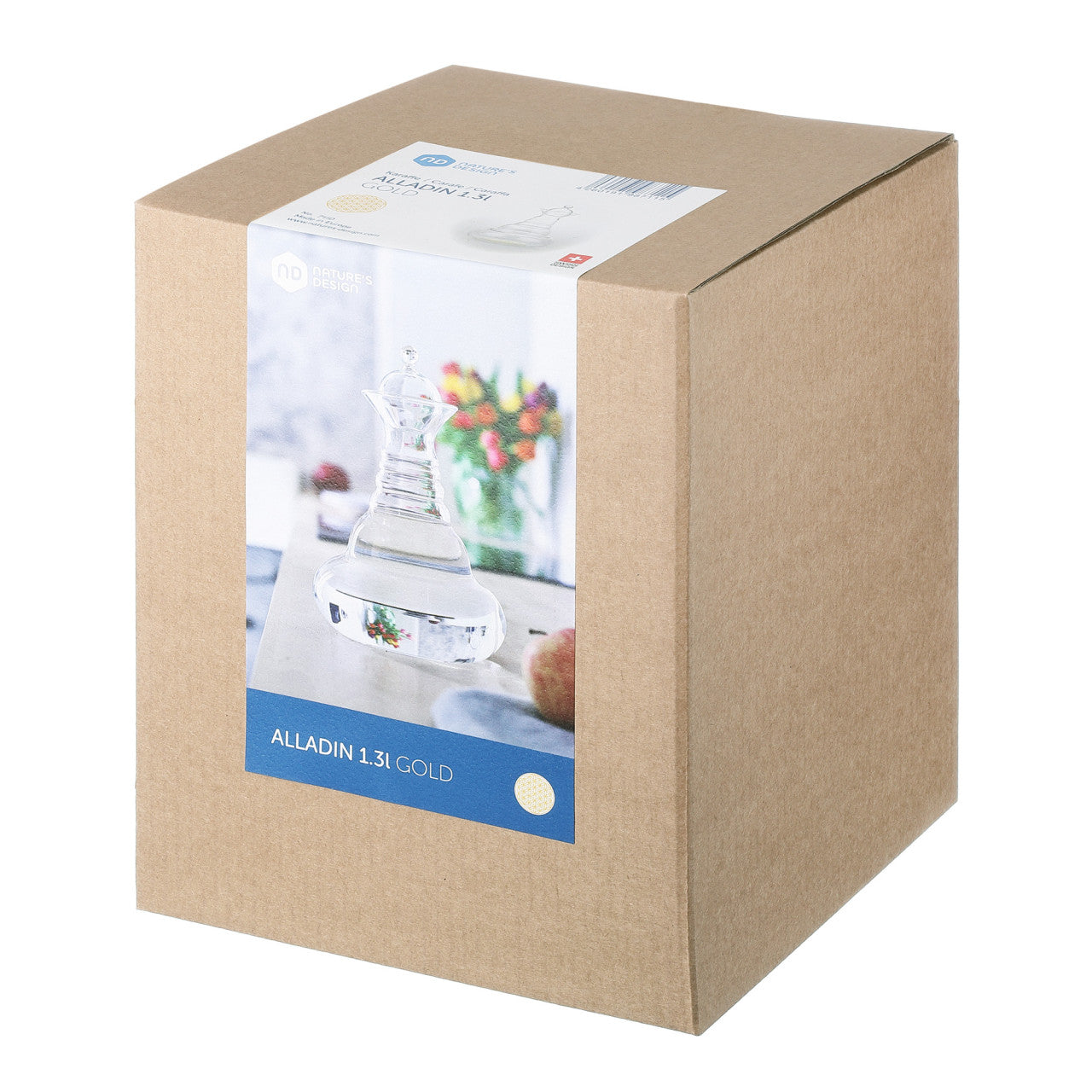 Die Karaffe “Alladin” ist die Standardversion im Angebot der Karaffen. Besonders die Variante mit dem Symbol Gold im Karaffenboden zählt zu den beliebtesten Produkten seit vielen Jahren. Die universelle Bauform mit der 6-welligen Strukturgebung ist abgestimmt auf die naturgegebene Entwicklung vom Leben. Auch vitale Wasserkristallisationen zeigen eine 6-fache Strukturgebung und damit ein hohes vitales Niveau an.