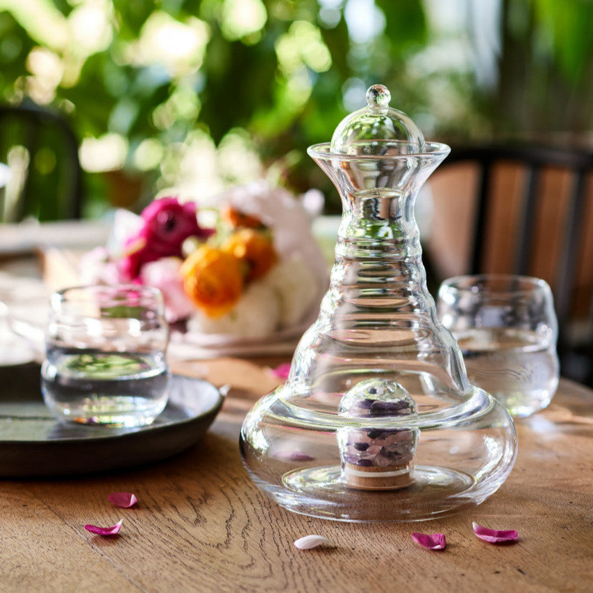 Bezaubernd anzuschauen und sehr kraftvoll. Die Proportionen des Goldenen Schnitts vitalisieren und strukturieren das Wasser. Edelsteine (Rosenquarz, Bergkristall, Amethyst) sind im Lieferumfang enthalten. Legen Sie diese in die Karaffenöffnung am Boden und schließen Sie diese mit dem Holzdeckel. Die Edelsteine geben durch das Glas Schwingungen ab und reichern so das Wasser zusätzlich an.