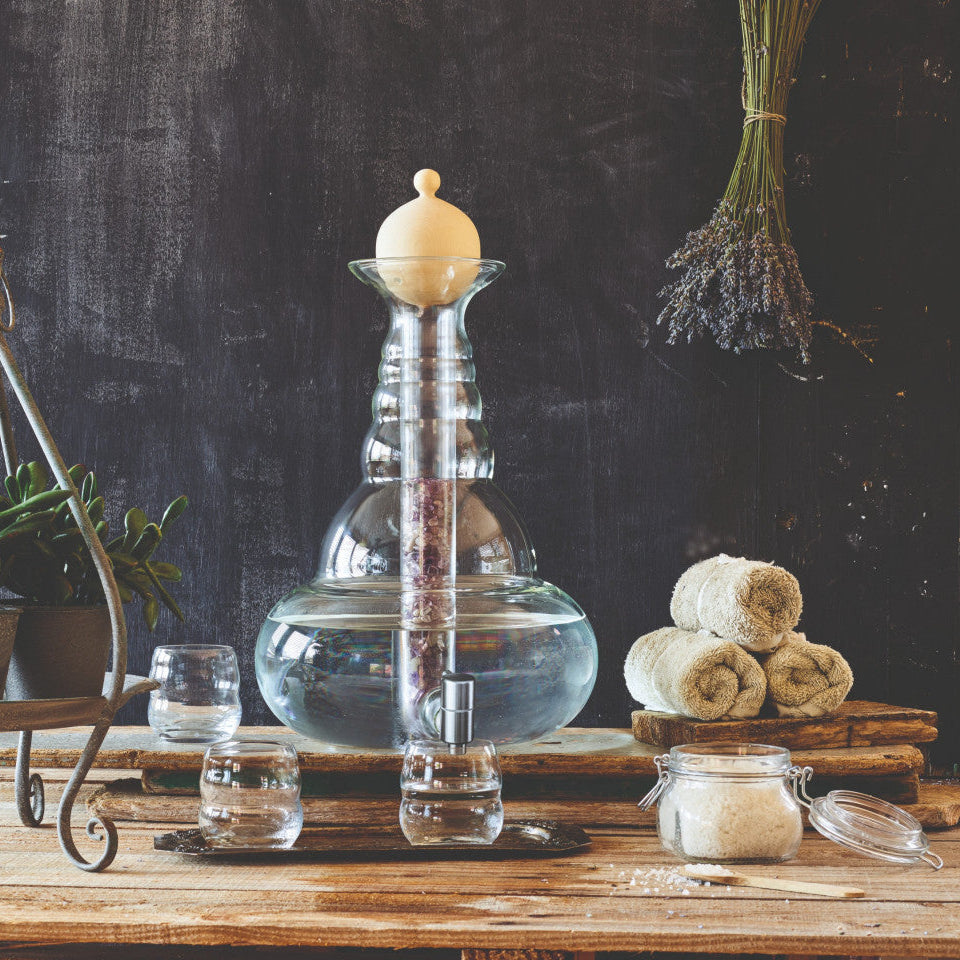 Wasser aus der Karaffe wird aufgrund deren Form und der Blume des Lebens natürlich angereichert und neu strukturiert. Eine perfekte Kombination mit dem einzigartigen Geschmack der Arve.